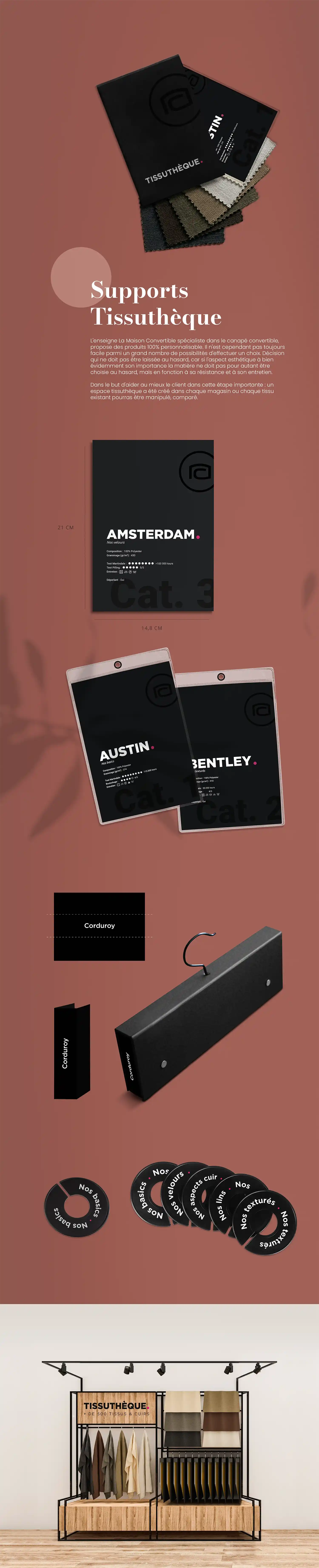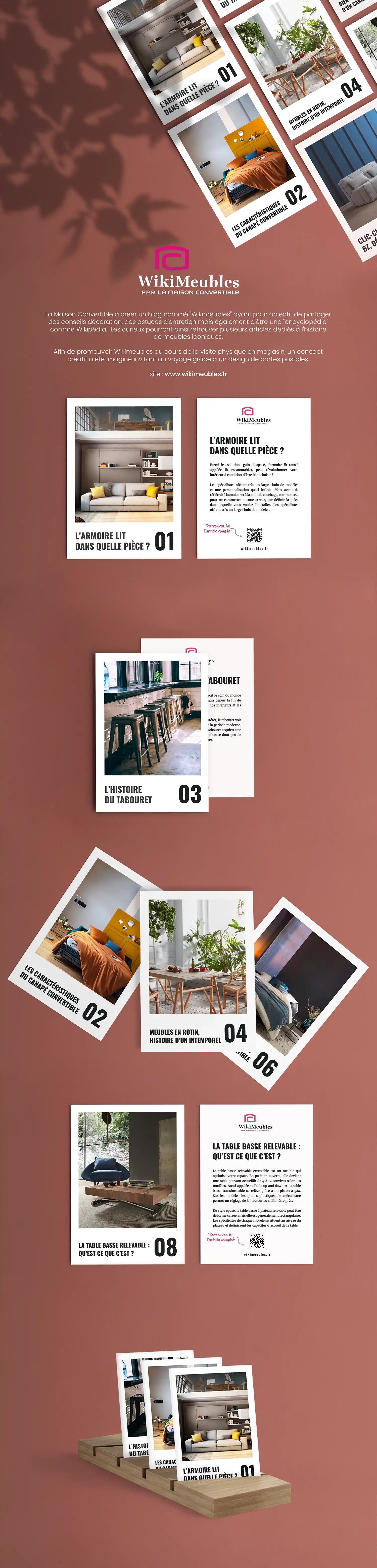 J’ai articulé cette intervention autour de supports variés, allant de l’édition à la signalétique de volume. Les fiches WikiMeubles, conçues comme des objets de collection, invitent au voyage à travers l’histoire du mobilier, tandis que la refonte des étiquettes produits et des supports de la tissuthèque vient clarifier la lecture de l’offre. L’intégration de présentoirs cubes modulables complète ce dispositif, transformant chaque showroom en un espace de découverte dynamique et structuré.
