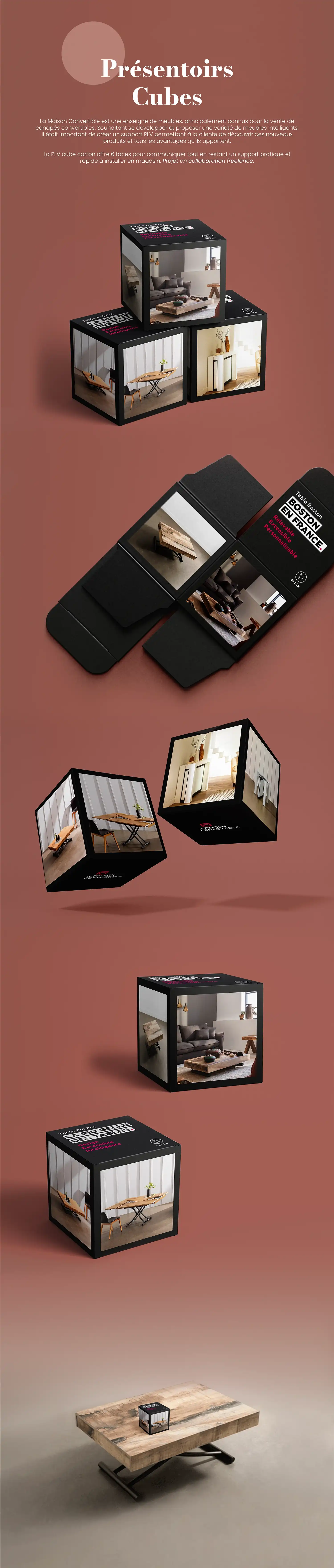 Pour l’enseigne La Maison Convertible, l’enjeu était de concevoir un écosystème de dispositifs capables de traduire la technicité de la marque dans un langage visuel à la fois pédagogique et immersif. À travers une série de solutions print et structurelles, j’ai imaginé une passerelle tangible entre l’expertise digitale et l’expérience client en point de vente physique.