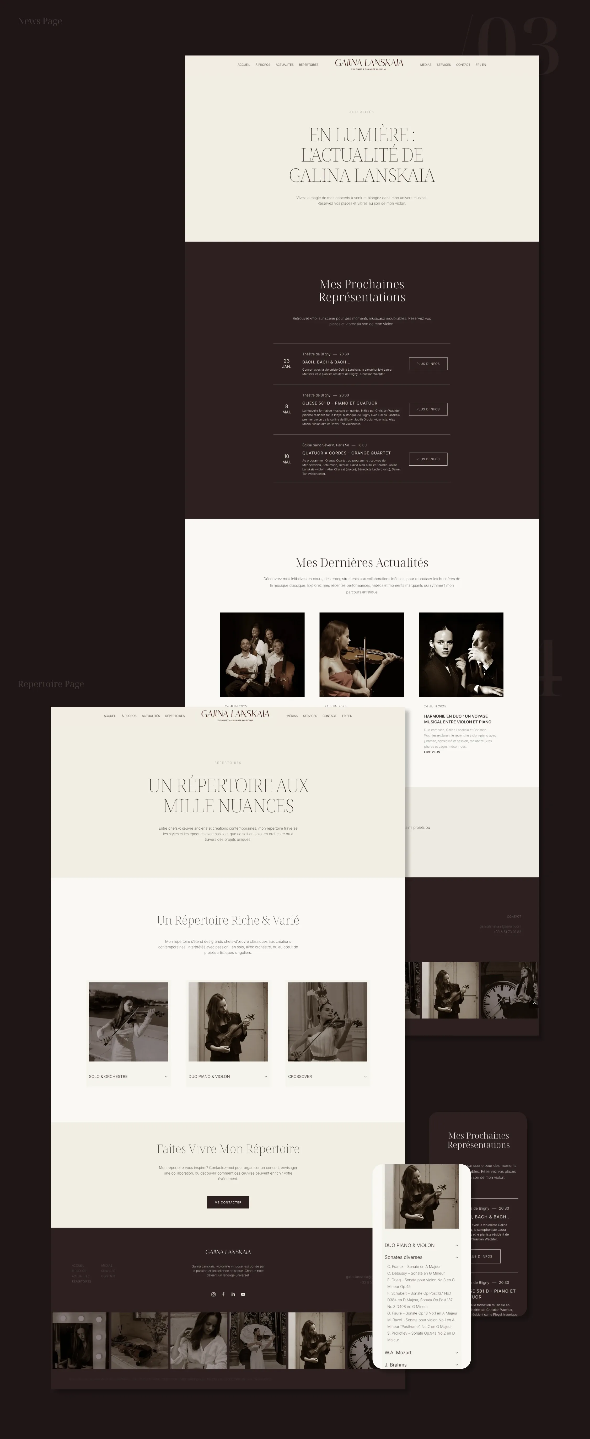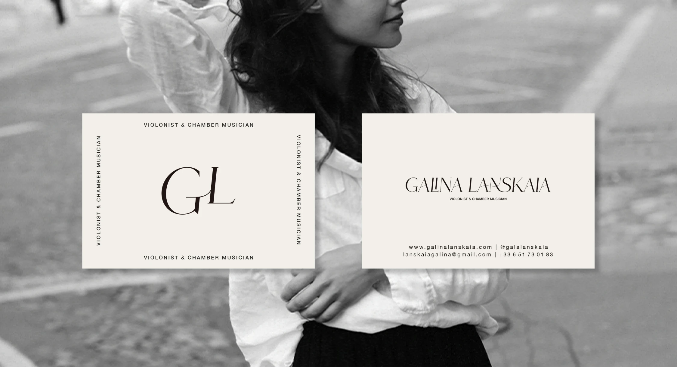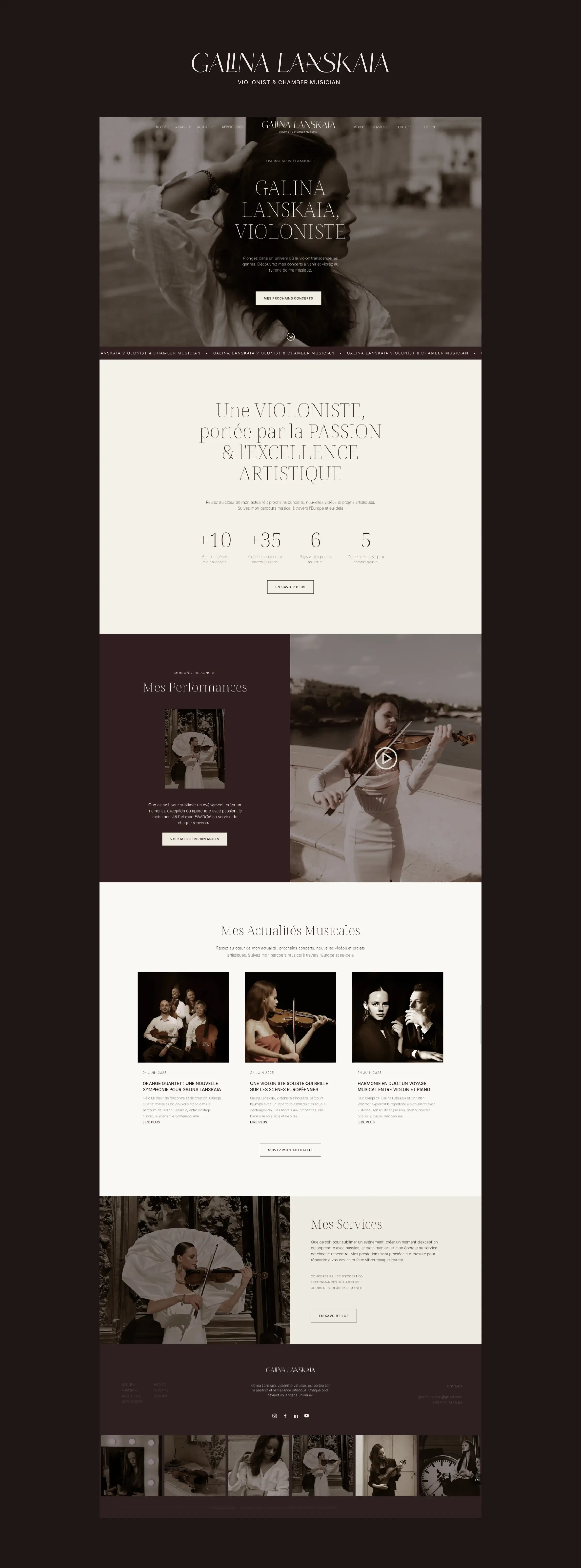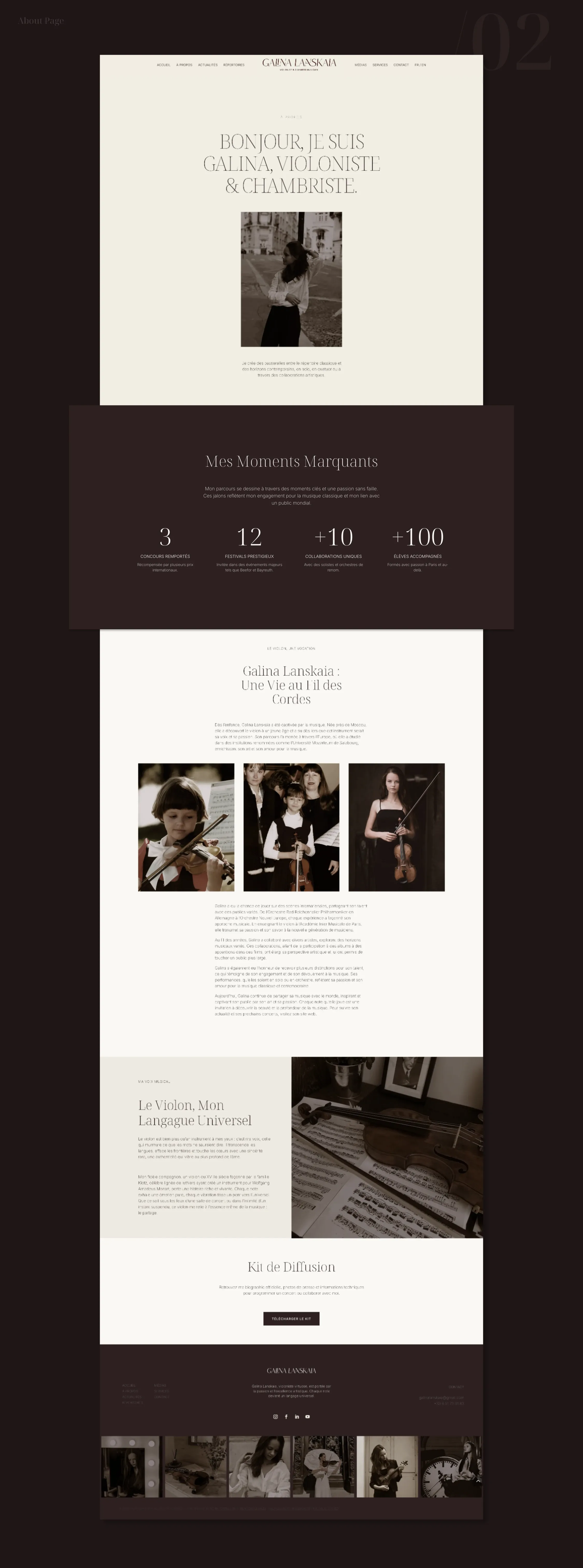 Pour la violoniste Galina Lanskaia, l’objectif était de concevoir une présence numérique capable de refléter la dualité de son univers musical : un équilibre subtil entre tradition et modernité. La direction artistique s’appuie sur une esthétique épurée, où des tonalités chaudes (brun, beige) viennent adoucir le contraste classique du noir et blanc.