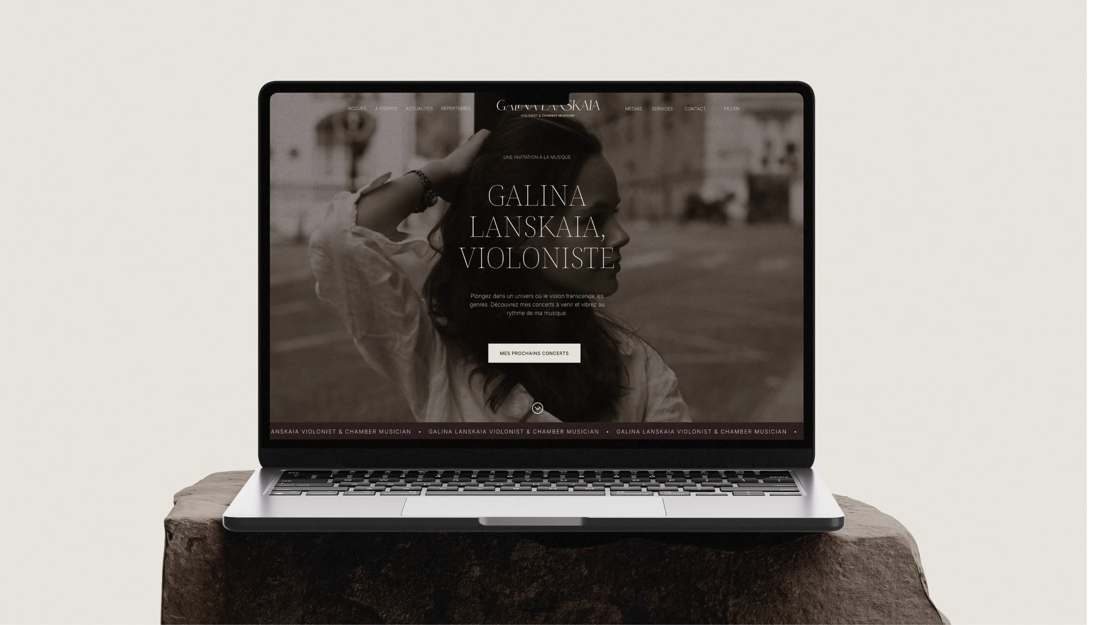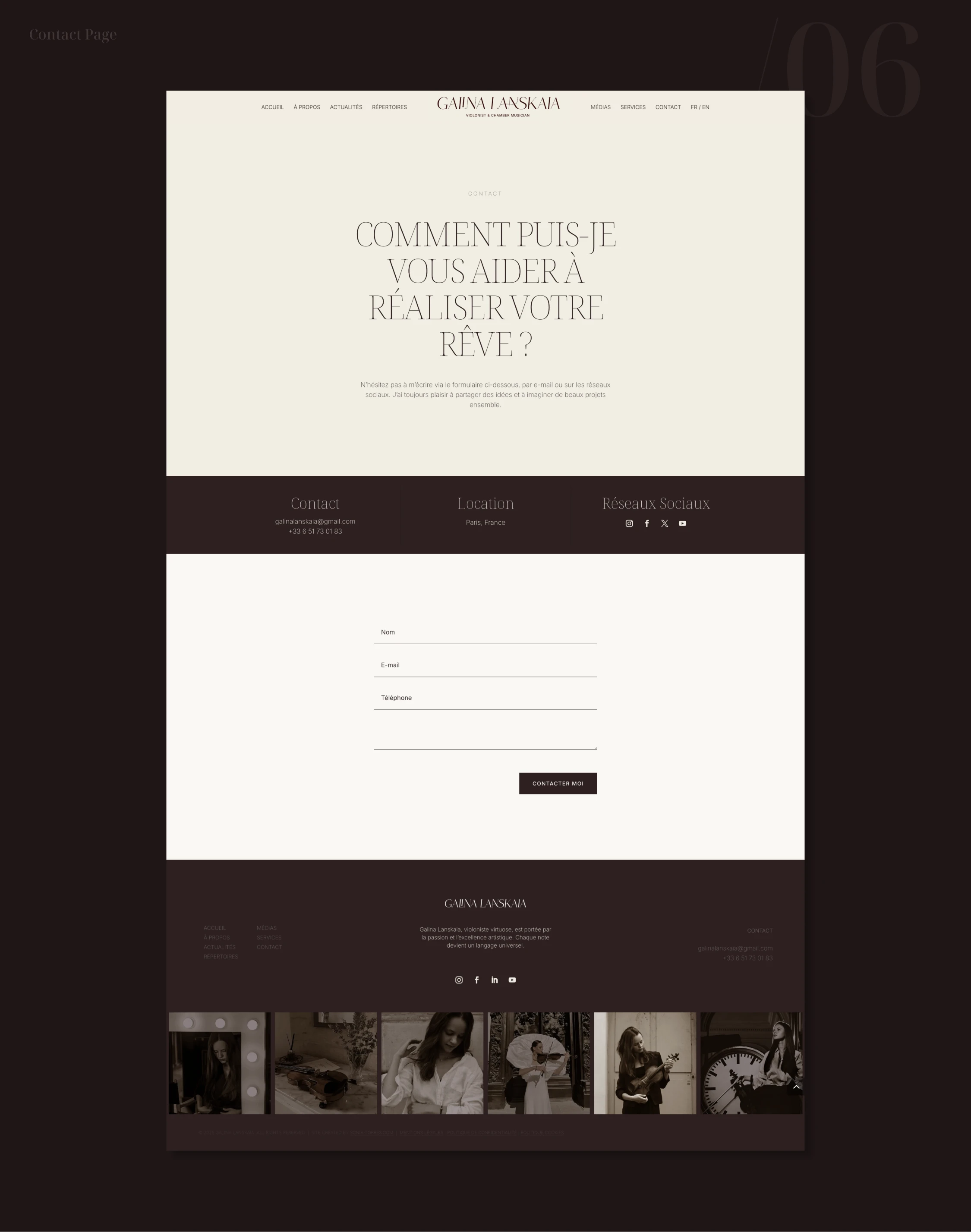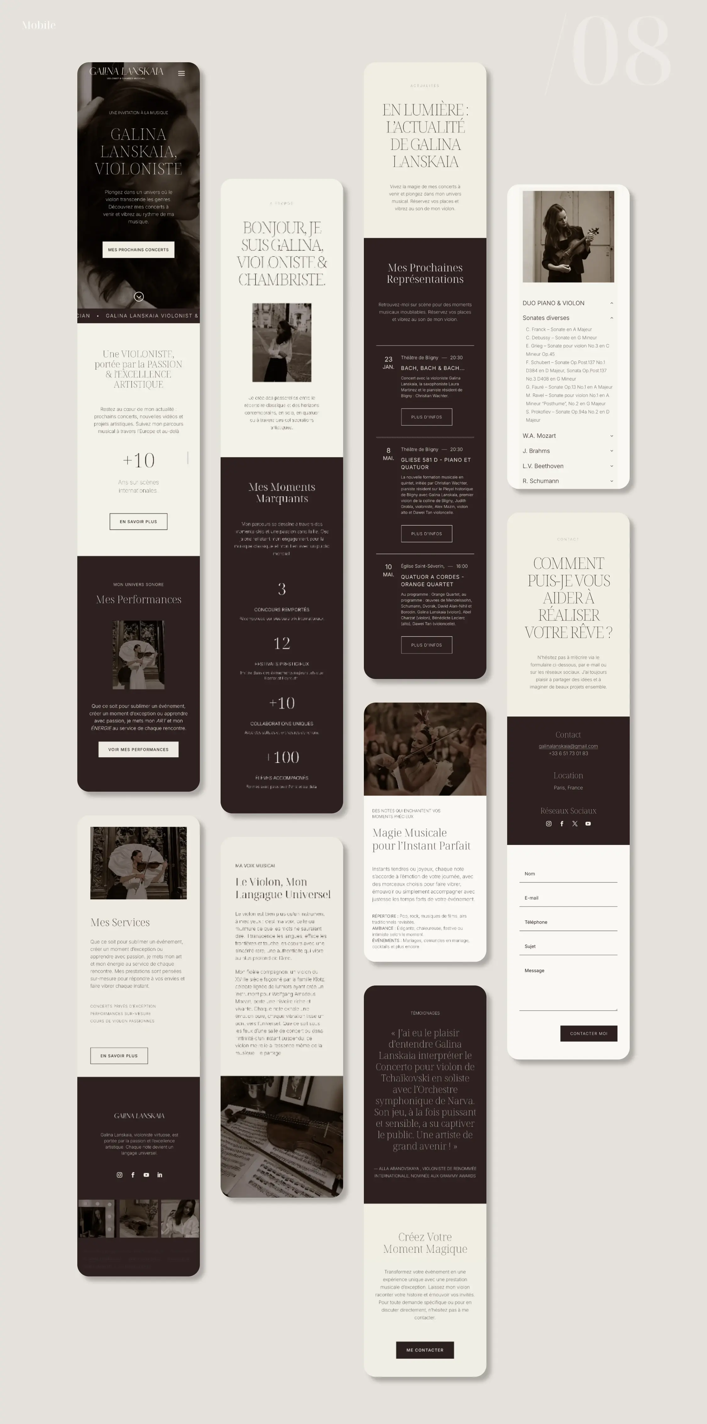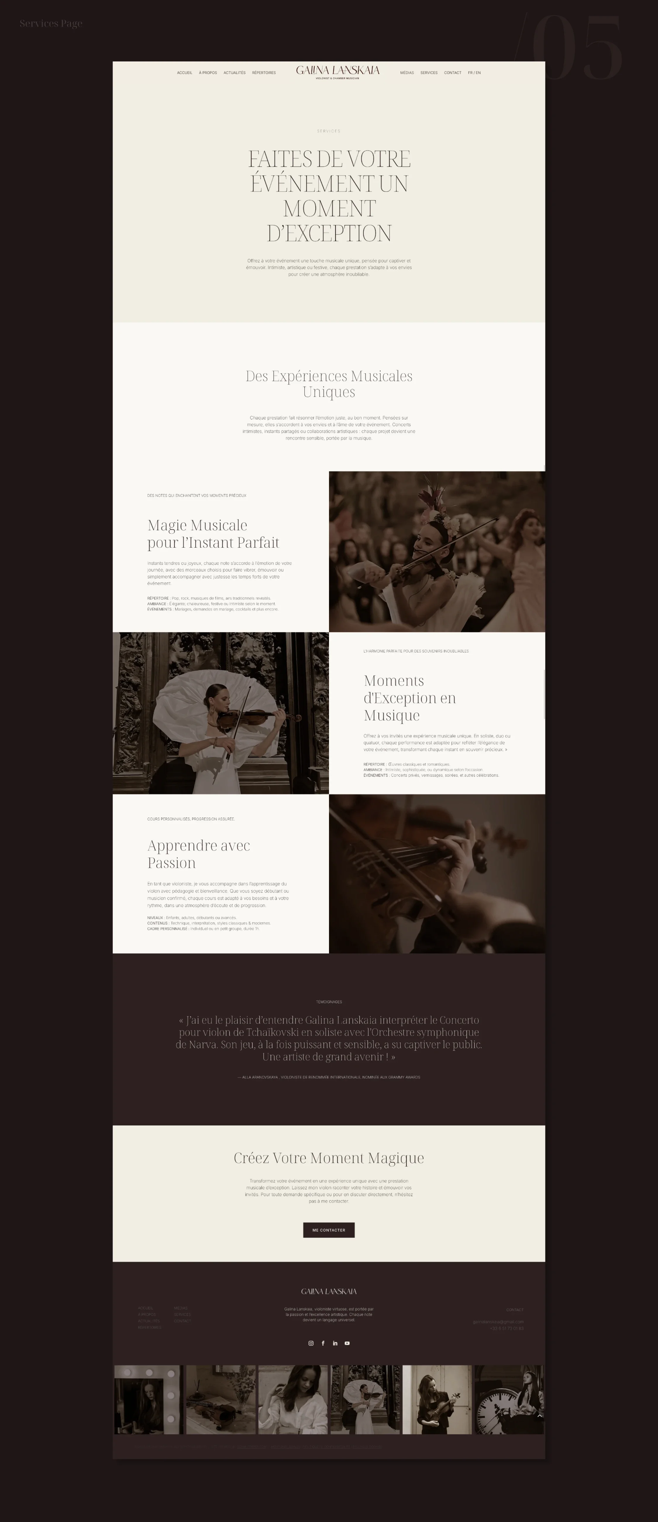 Pour la violoniste Galina Lanskaia, l’objectif était de concevoir une présence numérique capable de refléter la dualité de son univers musical : un équilibre subtil entre tradition et modernité. La direction artistique s’appuie sur une esthétique épurée, où des tonalités chaudes (brun, beige) viennent adoucir le contraste classique du noir et blanc.